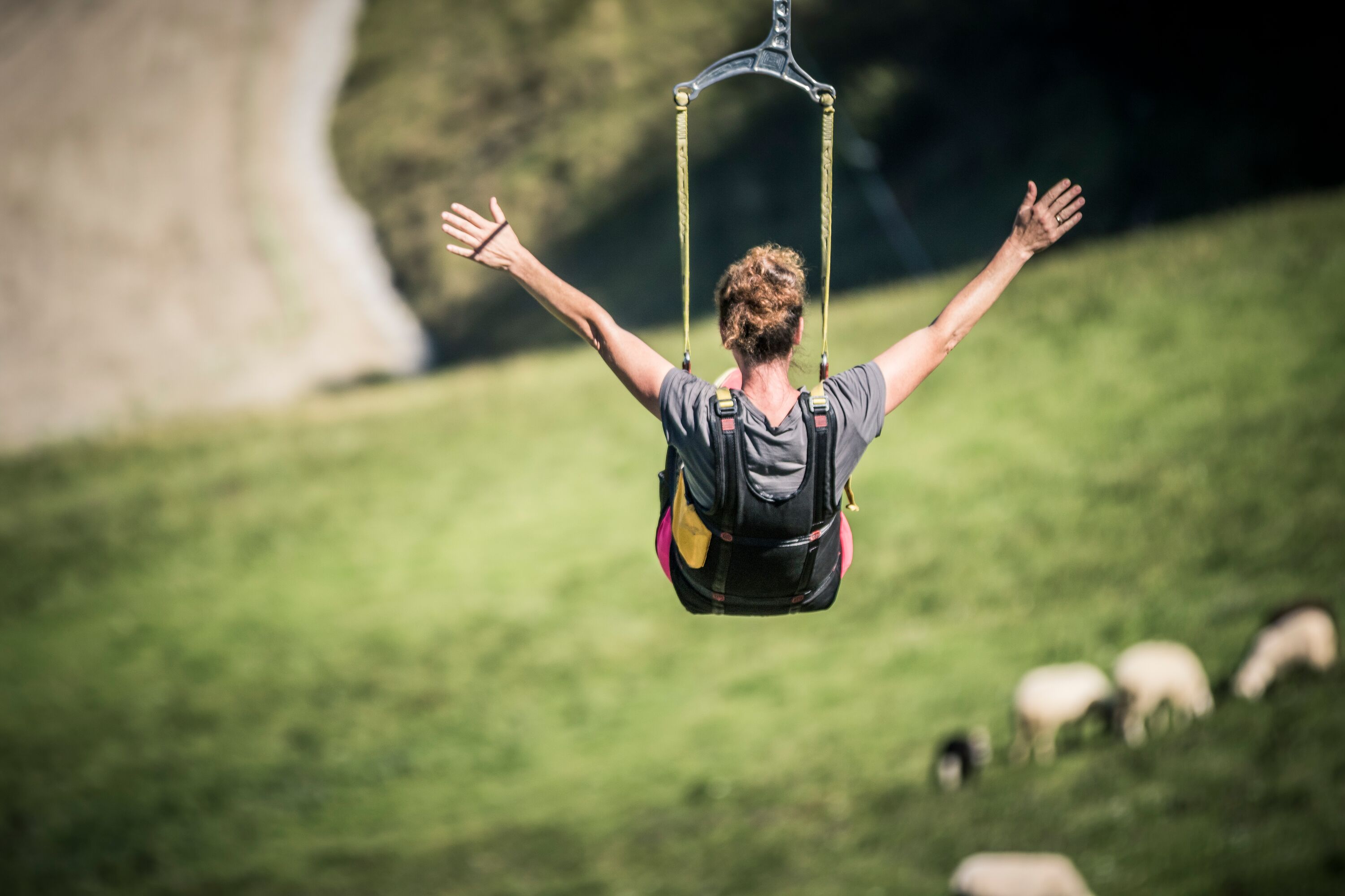 Nur eingehängt an einem Stahlseil „fliegt“ man mit bis zu 80 km/h – auf einer Strecke von rd. 700 Meter - über die Bergwiesen direkt ins Tal zum „Ziel-Tower“. Dort wird man sanft abgebremst und automatisch auf die Lande- Plattform gezogen. Das Erlebnis des eigene „Fluges“ wird automatisch von einem Kamerasystem fotografiert, das entsprechende Bild mit Geschwindigkeitsangabe wird kostenlos aufs Smartphone gesendet.
