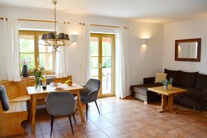 Die Ferienwohnung "Meisterhof - Hartsee", ein perfekter Ferientraum für bis zu 3 Personen. Der Essbereich ist mit Holztisch und typisch bayerischer Eckbank ausgestattet. Ergänzt wird dieser Raum mit der offenen Küche und dem Wohnbereich. Von hier aus gelangen Sie auf die überdachte Terrasse mit Westausrichtung und den Garten (wird von zwei Wohnungen genutzt). Das Schlafzimmer mit Doppelbett sowie das Badezimmer mit Dusche vervollständigen die Wohnung. Als zusätzliche Schlafmöglichkeit steht das Schlafsofa im Wohnbereich zur Verfügung.